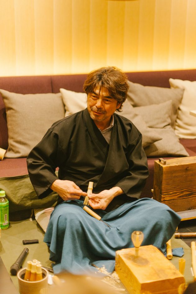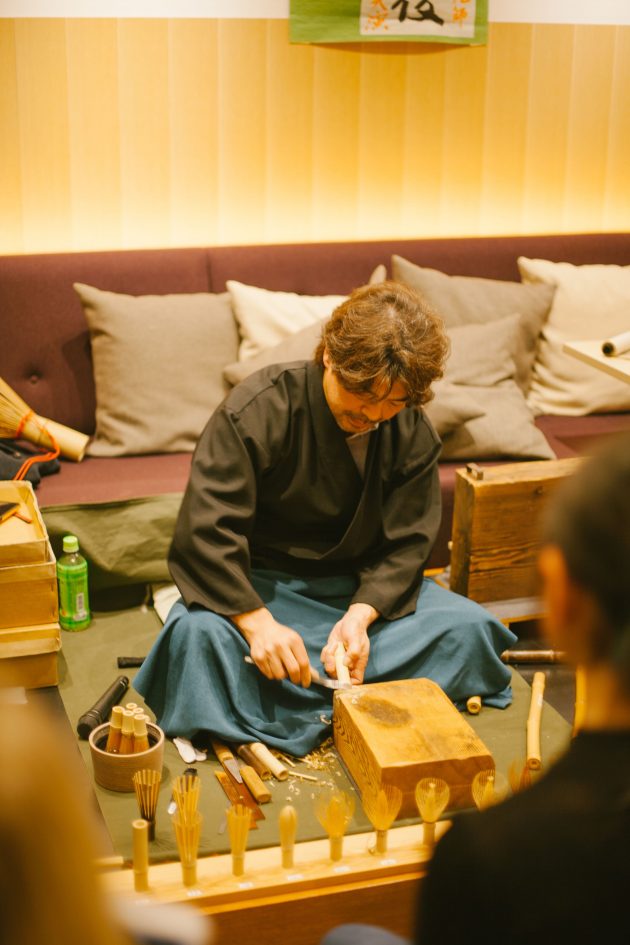 One chilly Saturday afternoon in February several members of the KJ team ventured out to Nara for a workshop with Tanimura Tango-sensei, a master craftsmen of chasen: tea whisks used in the Japanese tea ceremony. We had previously featured Tanimura-sensei in issue KJ89: Craft Ecologies, in an article by Ai Kanazawa of Entoten. The workshop was attended by a small group at NARANICLE, a relatively new event, café and retail space on Sanjo Street.