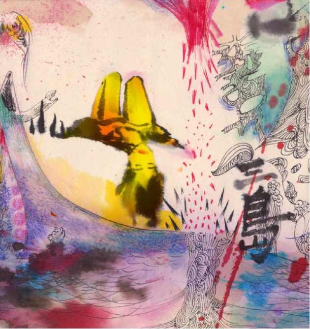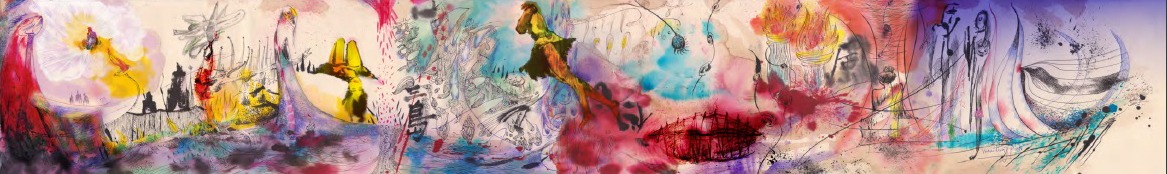A trifle hard to say, but I lean towards my first for Shiraishi Kazuko. It brought various structural elements into play, including radical feminism, a slew of references, my understanding of the various strands in Vernal Planet, settling on one set of eyes, the decision to meld sumi with humble media like the ballpoint, the idea to incorporate Mishima’s name in calligraphy, consciously blurring kaze. Besides, it was my first and remains my only illustration on Echizen kozo. Finally, the dimensions at 56.5″ x 8.5″ in width, and the narrative coming together on that expanse. It was sketched out pretty tightly; the final was a blur in execution.