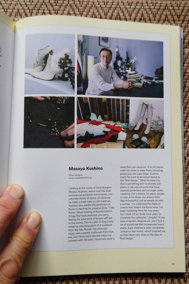 We were thrilled to see the magazine in the flesh: it’s extremely well-presented, with attractive soft matte colouring. No. 67 features an illuminating section of present-day Kyoto stats, profiles of famous people associated with Kyoto, an excellent section profiling Go On, a very outward- and forward-looking coalition of craft makers (“Go On in Japanese can be translated as ‘gratitude for one’s elders’”; various suggested walks, food culture, bar hopping and coffee culture, a lot on ‘New Wave’ innovations in craft/design/fashion, including Kyotographie, and even a page of quotes from Kyoto Kirai by Inoue Shoichi. We could tell a lot of editorial effort went into this — all in all it’s a very comprehensive introduction to present-day Kyoto,maintaining a great balance without dwelling too much on the heritage side of things. Bravo!