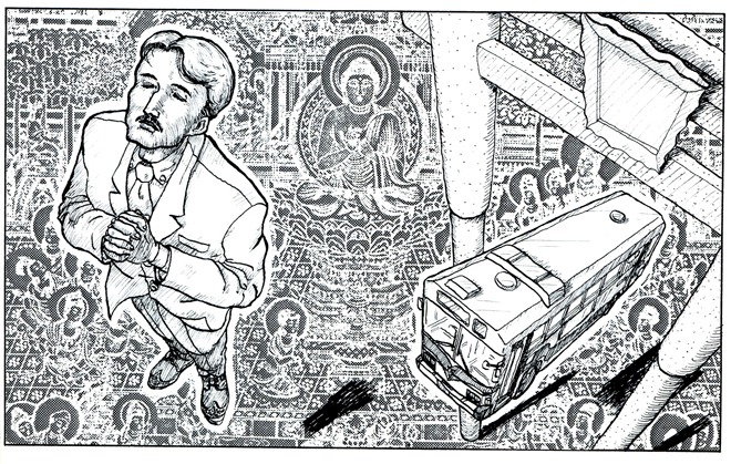 Hosomichi bent slightly in attempting to look out the misted bus window at blurry neon, concrete, bustling mobs crowding by outside, moving faster than the bus. Undoing his tie, he began to unbutton his shirt. Looking around him, he saw everyone on the bus doing the same, even the driver; some were down to their socks; the floor was covered with clothing and shoes. Many naked passengers had already begun to shout Hosomichi’s treasured obscenities as they ran up and down the aisle, which was now impossibly crowded. Hosomichi’s eyes rolled toward the ceiling as he gave a great shrug: “Ah, the hell with it,” he sighed; “I might as well go to work today.”