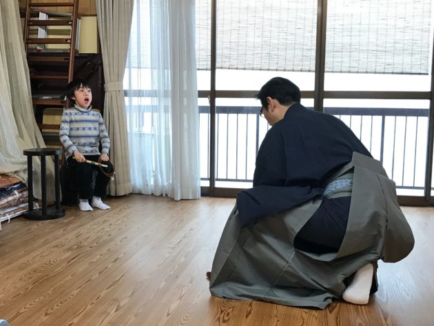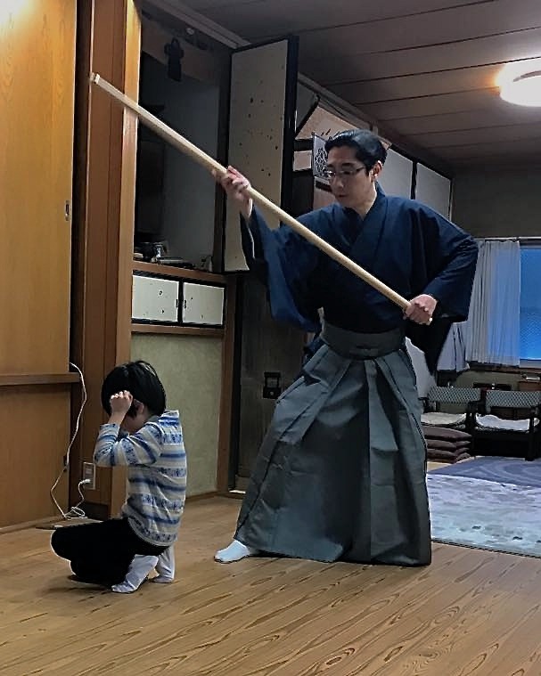 I think that Ataka reveals an aspect of unique Japanese spirituality. Further, while it is a challenging performance for actors that requires subtle skills instructed orally by a master, the story structure involves a powerful psychodrama, and I think the roles and the presentation evoke the audience’s emotions directly by the senses without depending completely on the words. For instance, there is a scene in which I (as the shite, Benkei) beat Yoshitsune (played by a child, my son). If you see a photo of the practice scene (see photo), I may appear to be abusing my son, however, when you see the play in its entirety you can see that’s absolutely not the case.