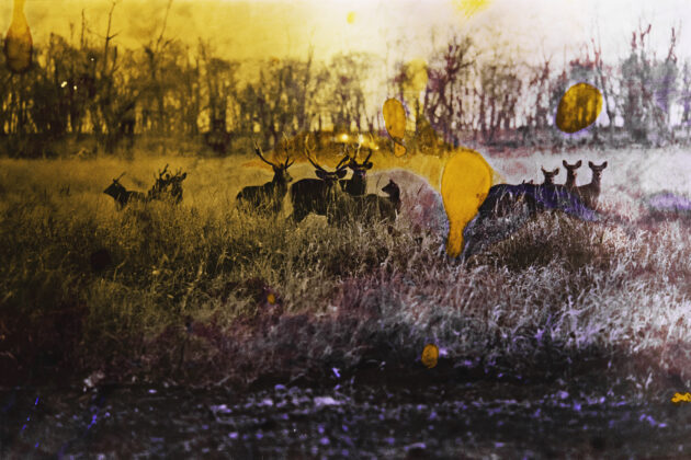 On the “white” floor, there are five more installations. First up, last year’s KG+ Select Grand Prize winner, Yoshida Tamaki, presents an expanded version of her series, “Negative Ecology.” While working as a commercial photographer, Yoshida began producing artworks using a thermographic camera. While developing a photograph of a deer, she accidentally contaminated the negative with a household substance. The luridly-colored result struck her as both beautiful and frightening, She began deliberately applying this technique, mixing shampoo, insecticide and detergent in with the chemicals to develop her wildlife photos – symbolically replicating the interaction between human-generated waste water and nature. The large format images, which are printed on upright glass panels and lit from behind, proceed from Yoshida’s own Tokyo neighborhood and bring us increasingly out into the wild through the open window on the building’s veranda, which was left open to the elements.