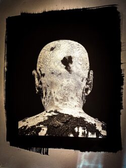 Iwane Ai traveled to northern Japan during the darkest days of the pandemic to photograph cherry blossoms in a place where the “boundary between human and nature is blurred.” Her installation also includes a slide show about her sister who died 15 years ago during cherry blossom time as well as a film about the family graves of Japanese Americans on the Big Island of Hawai’i which were inundated by lava flows. In all these works, beauty has a sinister aspect, as represented by the devil and fox masks in some of the photographs.