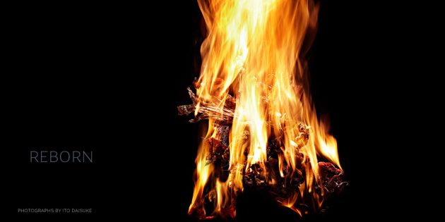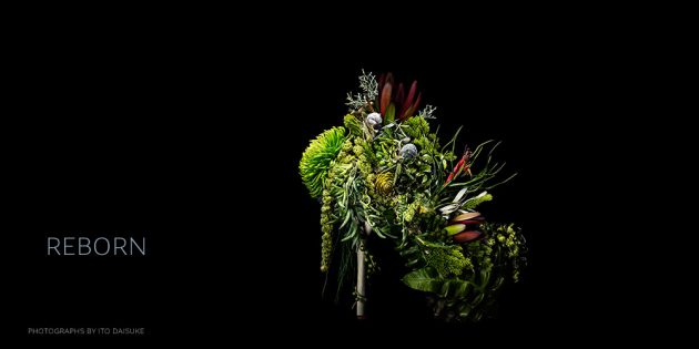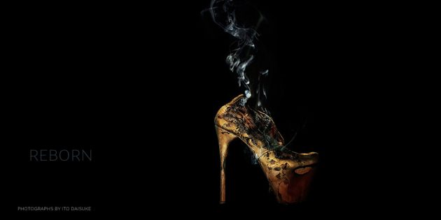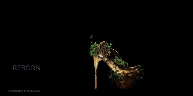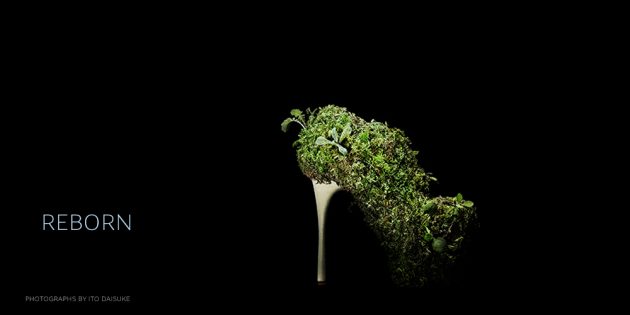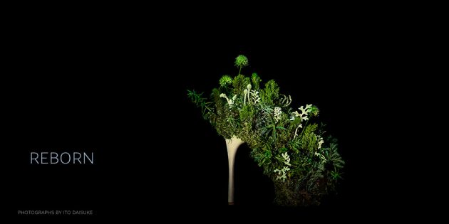 My Reborn’ shoes tell a long and humorous story. It follows a kisyoutenketsu (a four-part narrative structure originally used in Chinese poetry). I used one shoe for the whole process. Initially, I wanted to grow flowers on the shoe, but that would have taken three years or so, so I compromised by changing out the flowers, like Japanese ikebana. I made it less than one year after Fukushima. The fire symbolizes human disaster, natural disaster or war.