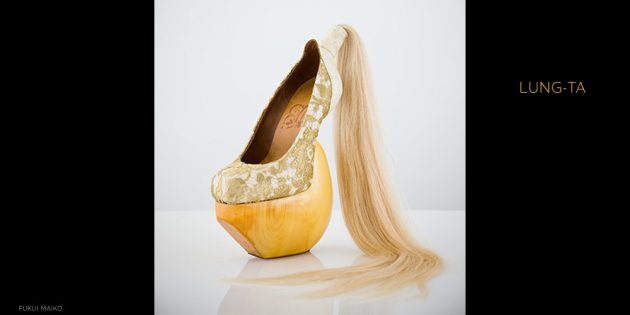My “Lung-ta” shoe was inspired by a horse opera called Jingalo. I already had an image of what I wanted to make; a shoe with a ponytail, but I didn’t have a story. Lung-ta means “wind horse” in Tibetan. For the shoe, I used shiro nameshi (white leather) which is only produced in Himeji, Hyogo Prefecture and was used for yoroi (samurai armor). I felt that the wind horse is connected to the divine, so I asked a craftsman who makes butsudan altars to help with this process. The antique lace is from France. I love this shoe because it represents a borderless mix of cultures.