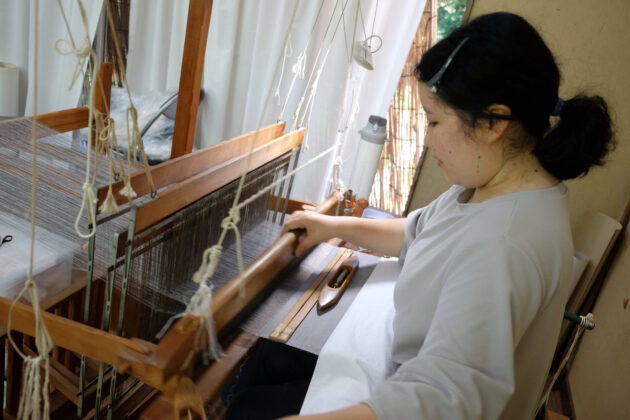 Before harvesting the cocoons, the silkworms themselves must be killed. Today’s main commercial method is to blow extremely hot air into the cocoons. This eliminates humidity, making them easier to store, but the silk’s natural texture is significantly affected. Shimura found a more natural and time-tested alternative: the cocoons are packed into wooden barrels with salt for two weeks. They are then taken out from the barrel and dried naturally so that the silk’s natural texture and strength are maintained. Next the threads are reeled in batches, and, in what used to be the school auditorium, Katsuyama’s two full-time employees focus on the weaving using two looms. On the smaller loom, Miyajima Mizune weaves usuhaginu, Katsuyama’s thinnest fabric used to make new kimono. The warp and weft threads have been made by the silkworms which were grown by Miyajima herself. She then adds color to the fabric with natural dyes like yasha, made from the Japanese green alder tree, and indigo. On the larger loom Akimoto Shigeko, Shimura’s apprentice, weaves an even thinner fabric which is used to restore the textile of Japan’s National Treasures.