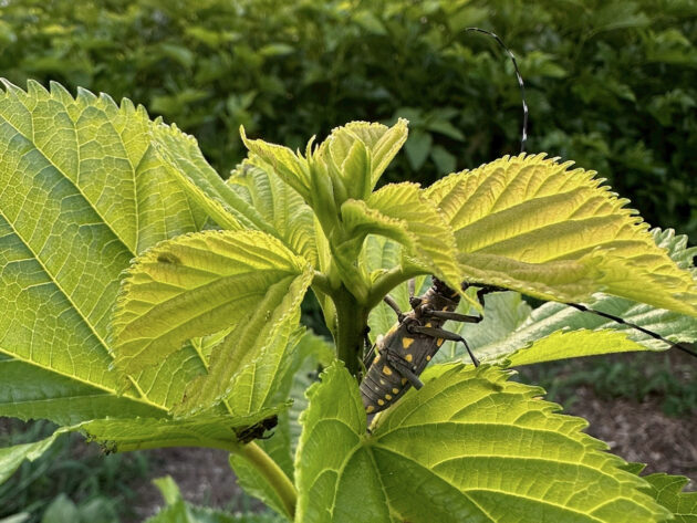After trial and error, Katsuyama selected three varieties of mulberry trees: Nezumi-kaeshi, Kikuba, and Kenmochi. Both spring and fall silkworms are fed with these three varieties, according to their growth stages, to ensure that the size of the cocoons is consistent. The worms won’t eat the newly grown, bitter leaves on the tips of the branches; the larger leaves on the bottom are too coarse. They are fed with only the tenderest leaves from the middle part of each branch.