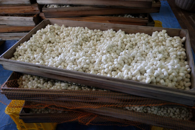 On the Iijima farm, mulberry trees are grown. Their leaves are the only food source for silkworms. The cocoons of these caterpillars are harvested to make silk twice a year, spring and fall. From the various species of silkworms, only those that produce finest thread are selected and bred each season.