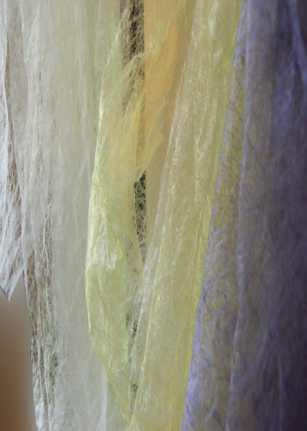 With a BA Honors Degree in Fine arts with a specialty in printmaking in the UK, Elaine Cooper experimented with many fibres, cotton, and plants in the 1980s in an effort to create thinner and more translucent papers for her works. Discovering washi paper at a Japan Festival in 1991, which featured paper and washi from Mino City, left her feeling that she had at last discovered a medium with the beauty and physical qualities she had long been searching for. “I had found the perfect paper for my work, it was strong and translucent I don’t think I slept for days as my time was spent in the studio pushing the paper to its limit,” Cooper recalls. “I knew then discovering its process of manufacture was something I needed to understand to fully appreciate what it was I was working with.”