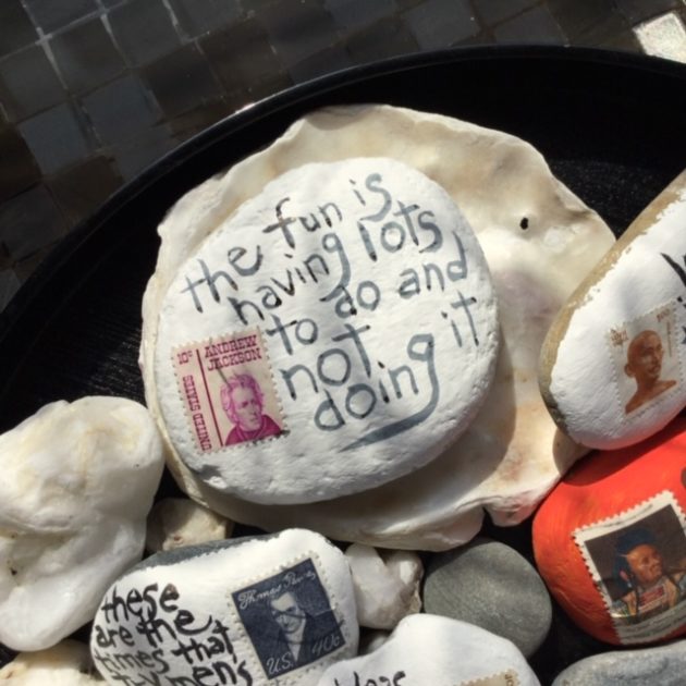 Today, Davidson is exploring new materials for her etegami (including stones, shells, and fans), runs the Etegami Fun Club on Facebook, and is creating an etegami-collage style of postcard art under her Stamp People Series, available on Red Bubble. But she always keeps the philosophy of etegami in her heart when she’s creating: “If I notice I’m trying too hard to be a ‘good artist’ or to impress people, I try to return to my etegami roots and remind myself that I paint to reach out to others and I think about the receiver as I paint,” she says.