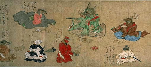 Although the tanuki in the scroll seems to have only achieved limited poetic accomplishment in the eyes of the other animals, the tanuki’s artistic talent has been well known since antiquity. In the Nihongi (720), an episode tells of a tanuki (actually it was called a mujina but the tanuki, mujina and anaguma share similar characteristics and that all became combined into the tanuki’s image in popular culture) which transformed itself into a man and sang a song. Later commentators suspect that the story was a fabrication by a young girl who tried to conceal the evidence of her secretly serenading lover. The episode attests to the belief in the tanuki’s magical ability to transform itself and the tanuki’s longstanding ability to mimic many sounds.