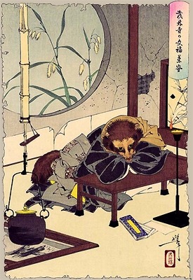 During the Edo period, haiku poet Yosa Buson added gaiety at dusk one forlorn evening when he sang with amusement of the tanuki’s trick. In that era the tanuki was frequently associated with metamorphosis and with Buddhism, perhaps because its round head resembles the shaven head of a monk. The tanuki was believed to change not only into a monk but into various other forms.