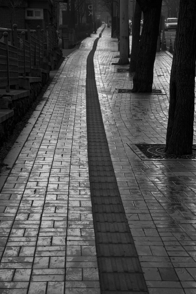 We kept walking. Wedged between the glass office buildings and the cars passing us, under the swaying pruned branches of trees, we walked the straightest road in Seoul. At the end of it, far off and dark, lit only by a string of white lights of a snaking road, a mountain loomed.