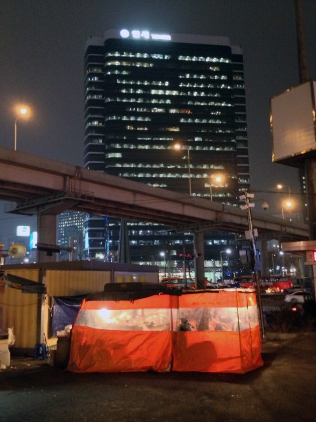 It was only eight. But in the dark alleys behind the station there wasn’t a soul. Around each corner was the same. Nothing moved but the cool April wind. I had often felt alone in Seoul, going days without sharing a glance with anyone on the streets but here felt like scorched wilderness. Under one streetlight was a coffee machine. Suhan stopped.