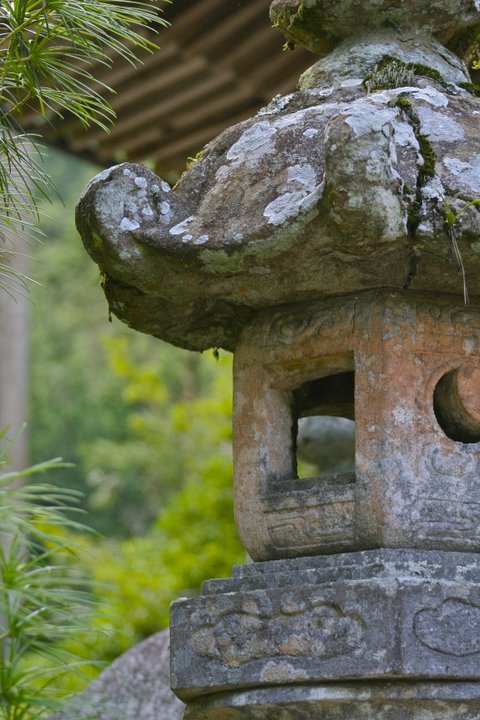 Everything about this place seems to belong here. The water which falls from the shadows of the forested hillside at the back of the pond and pools before running on to the river below. The temple, sitting so comfortably by the pond, together shaded by the spreading cover of old trees. The gravel path that casually turns to avoid tree roots as it cuts through the moss carpet beneath the trees on its way out to the prayer hall. All of these seem not so much separate elements fitted together in one place, but rather as elements that are very much of the place. Born of it, nurtured by it, at one with it. Complete.
