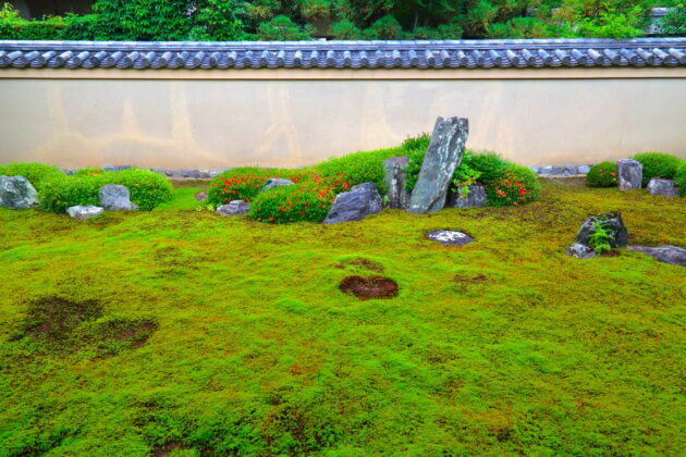 By the Kamakura and Muromachi periods, natural boulder Shumisen stones were used in karesansui gardens, the dry landscape gardens composed of natural boulders typically set in fields of raked sand. One such example can be found in the Muromachi-period Ryōgintei garden at Ryōgenin temple. Ryōgenin is one of the many subtemples in the large Daitokuji Zen monastery in Kyoto. The garden is on the north side of the hōjō, main hall, where the rooms facing the garden were used as the head priest’s residence and studies. In Ryōgintei the stones are placed in a field of carefully tended moss, although the original surface was more likely to have been sand, or simply packed earth.