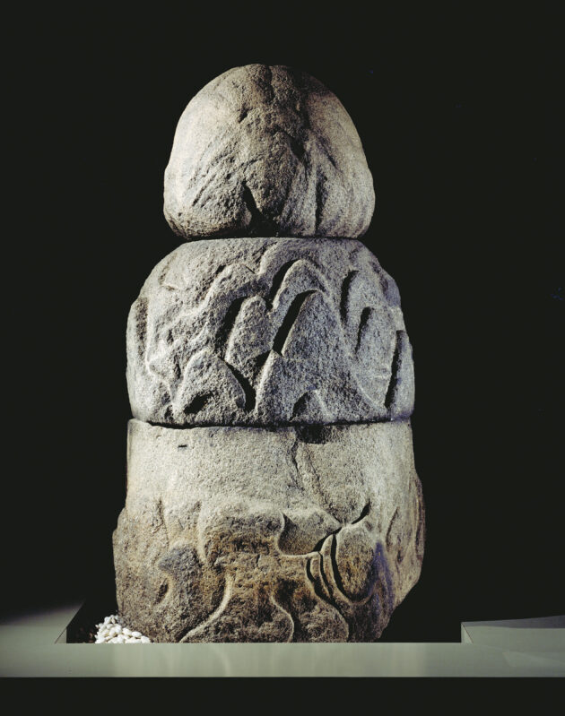 Jump forward about 1,300 years. In the year 35 of the Meiji period, or 1902 by the Western reckoning, an architectural dig about 25 kilometers south of Nara in the Asuka region found a number of interesting artifacts. Among them was a large stone carving of a Shumisen image. It was made in three sections which, when stacked one upon the other, stood about 2.3 meters high. Research has suggested that there would have been a fourth piece at the bottom so it would have been even taller originally. The sides were carved with images of mountains, and the inside was hollowed out to create a kind of reservoir. Furthermore, it was shown that if the sculpture was attached to a flowing water source, it could be turned into a fountain with spouts streaming out in four directions, just like the rivers of Mount Meru. It is believed that this garden fountain may have been the very element that Michiko installed in the Southern Court of the Empress Suiko’s palace.