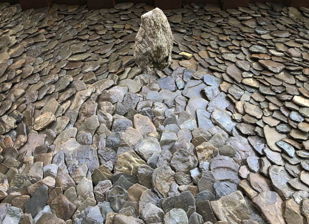 Shumisen imagery continued to be placed in gardens throughout the following eras but in future years, the design changed radically. Rather than creating sculptural elements with literal carvings of mountains on the sides and actual flowing water, Shumisencame to be represented by a simple standing stone, a natural boulder taken from a forest or a river, unaltered by the human hand and set into the garden. These natural Shumisenstones hearken back to the sacred boulders of Shintō known as iwakura, and represent one way in which continental culture was modulated to better settle into Japanese society.