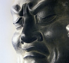 Over nearly two decades I’ve hiked up to visit this National Treasure sculpture more times than I can remember. At first, I saw only the stylized theatricality of the genre, strikingly manifested in a companion trio of dynamic celestial warriors, all gravely preoccupied in crushing recalcitrant demons underfoot. But there was something else, an element I couldn’t quite identify. I was drawn back, again and again. One day, without thinking, I tried to mold my own face to mirror the Bishamonten’s absorbed expression. — and couldn’t do it. None of the parts matched. That’s how I discovered the genius of that anonymous Heian master sculptor, who combined so precisely more contradictory emotions than any human countenance could ever express in a single instant.