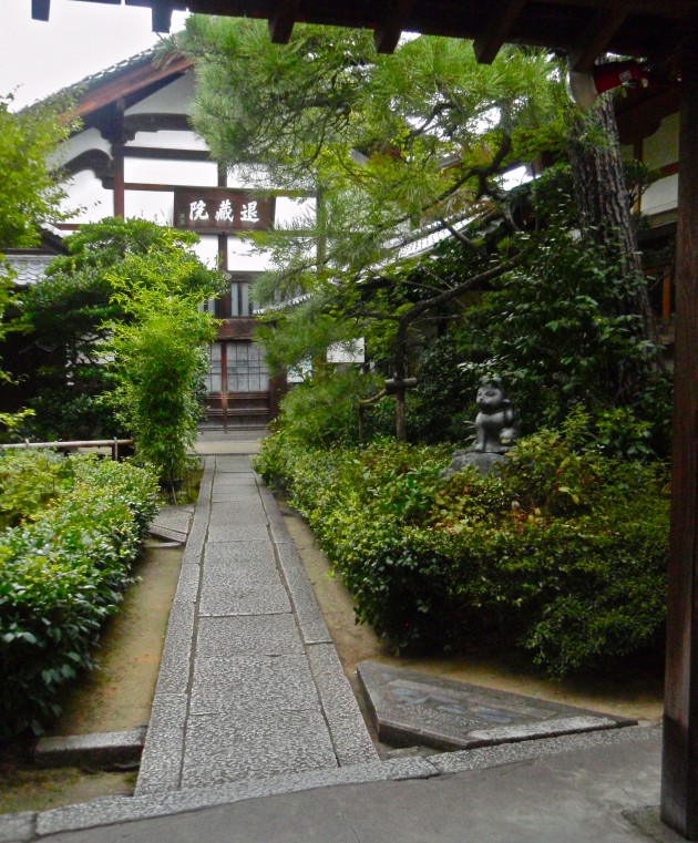 As we make our way to the temple’s living quarters we are greeted by the yapping of the resident dog, Hina-chan. The stairs — lined with the figures of Snow White and the Seven Dwarfs, all of them skipping — have a view out onto a grand old bronze bell. It is likely the same bell that Matsuyama the young boy was scolded for ringing at inappropriate times (see KJ 70; ‘Kyoto Lives’ pp. 70-71).