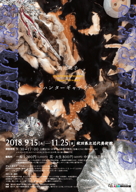 Her upcoming, first large-scale solo exhibition includes a selection of new works as well as a few previously exhibited pieces. Inspired by the interaction between humans and their natural environment, the show focuses on the theme of the Hunter Gatherer. Highlights include an installation called Dream Hunting Ground, centered on the pelt of the indigenous moon bear; a film of the winter river of the Tohoku Region (Northeast Japan); and a project called ‘Storytelling Table Runner’, a series of individual stories of created with 150 pieces of sewing, knitting, and embroidery.
