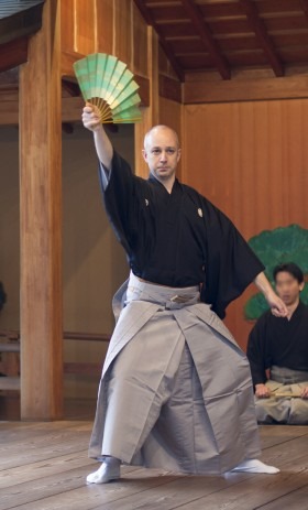 I think there are many difficulties for foreigners on the stage. The language, body shape, other people in the Noh world. My teacher clearly enjoys teaching foreigners, and he accepts them in the same way that he accepts his Japanese students, but this might not apply to all teachers. Also, not all teachers teach amateurs the way Udaka-sensei does. Many teachers consider amateurs as hobbyists. Udaka-sensei, instead, puts exactly the same effort into training amateurs as he does with professionals, so the relationship becomes very close. He gets angry, he stresses out. This is very good and it’s why we are able to do full Noh plays. He pushes us to grow up as much as we can.
