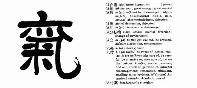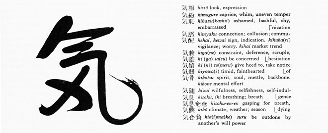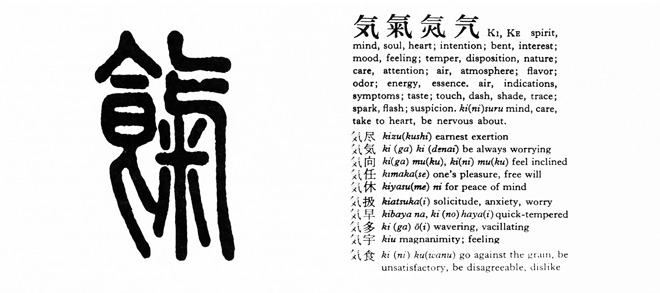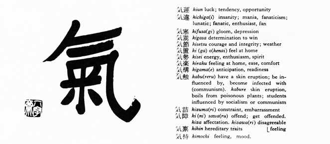 Although the concept and ideogram for ki (気) originated in pre-Han Dynasty China, its modern Chinese usage has remained largely confined to medical and meteorological terms. After its introduction to Japan in the seventh century, however, the concept assumed a much wider significance and came to permeate colloquial speech. Recent dictionaries, for example, list over 600 common Japanese terms and expressions employing the ideogram, compared to about 80 in Chinese. I cite this semantic vigor to defend my use of ki, the Japanized pronunciation, rather than ch’i or qi, the more venerable Chinese readings.