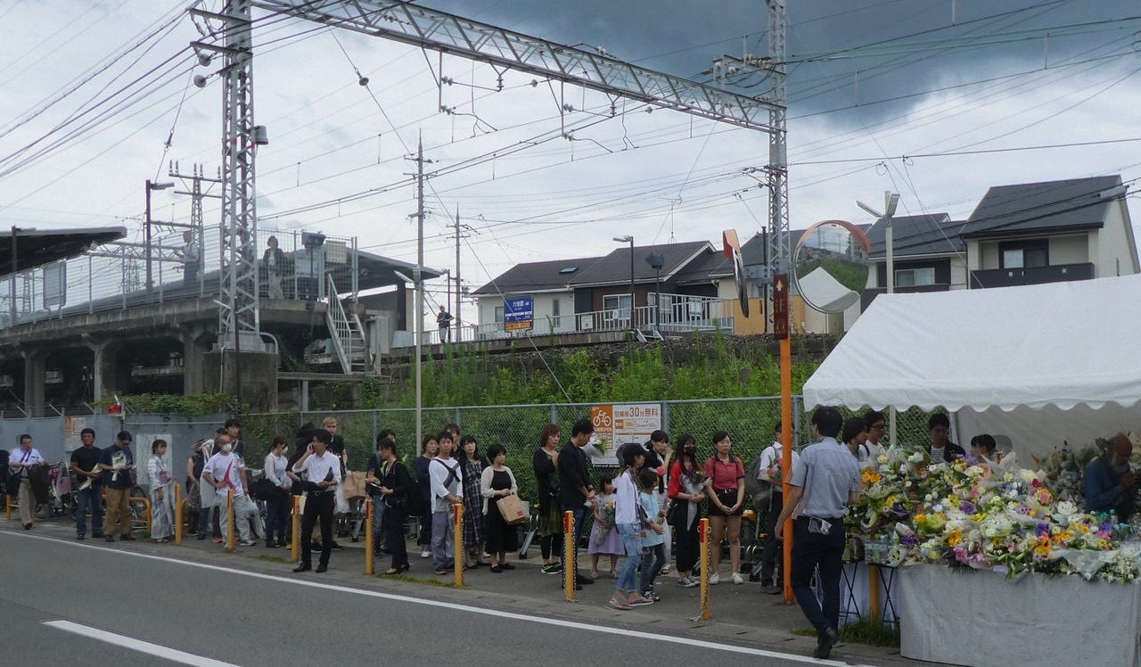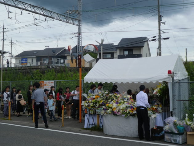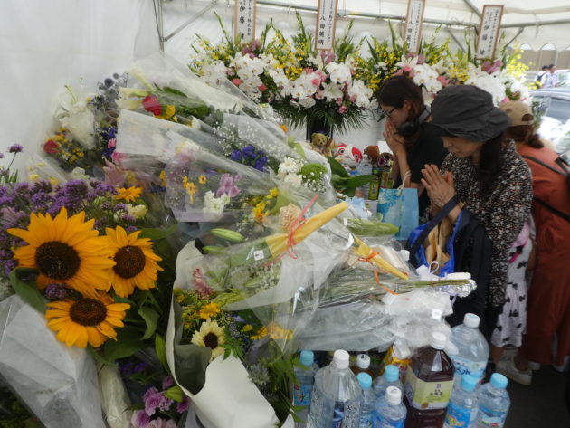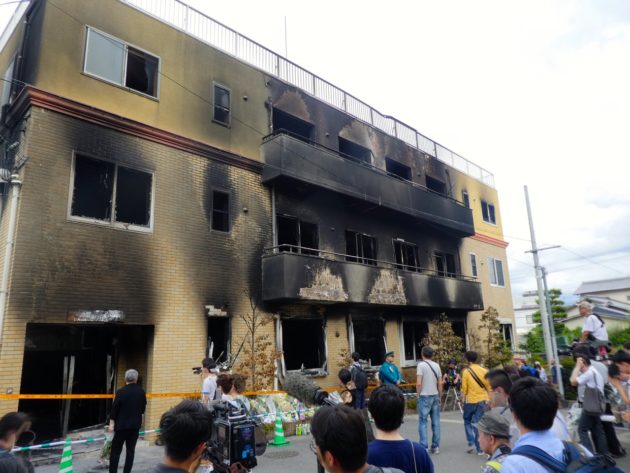 Mutely they join a line stretching from the station to an improvised, far-too-small tent in a cramped bicycle park, to offer flowers and prayers to the 34 victims of last Thursday’s tragic arson. There’s no sidewalk; cars brush past young and middle-aged fans waiting patiently in Kyoto’s rainy season humidity, under threatening clouds. Flowers pile up, along with bottled drinks and stuffed toys, in front of elaborate floral tributes bearing the names of Junko and Hideaki Hatta, KyoAni’s desolated founders. Thirty-six traumatized survivors are in hospital, many in critical condition. No names have yet been released.