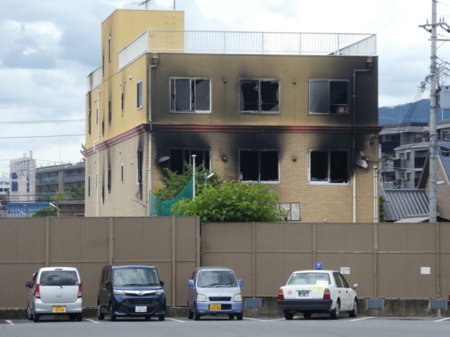 More flowers, presumably from family members and company colleagues, have been placed outside the burned-out studio building, a short walk down a narrow sidestreet among typically crammed-together suburban homes. Hushed visitors mill around, disoriented, in a space where there is suddenly no conventionally defined pattern of how to behave. The air is still acrid with the stench of the all-consuming blaze; a guard in a blue shirt reminds people politely not to step into neighbors’ empty house-front parking spaces.