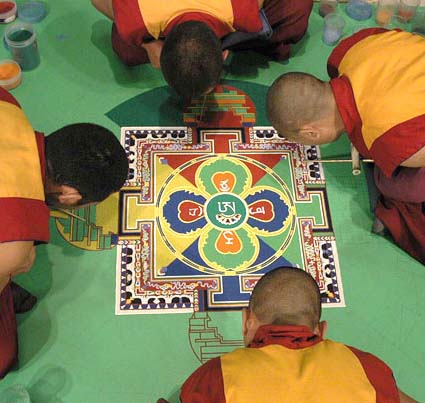 I WAS REMINDED of that cartoon when a baker’s dozen of Yellow Hat Tibetan Buddhist monks from the Dreprung Loseling Monastery (now in exile in India) set up shop for a week in a tiny concrete vault of a gallery at the Santa Monica (California) Museum of Art to “perform” their sacred sand mandala of Amitayus Buddha (Cycle of Boundless Healing) and attendant music and dance rituals.