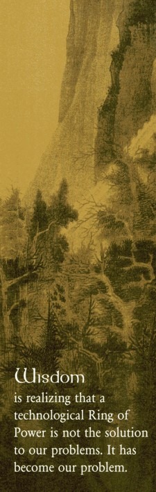 In contrast, Hobbiton expresses Tolkien’s nostalgia for the vanishing rural England of his youth, but we should not dismiss such homesickness with the reassuring Buddhist maxim that “everything passes away.” Our collective attempt to dominate the earth technologically is related to the disappearance of the sacred in the modern world. If we can no longer rely on God to take care of us, we must secure ourselves, by subduing nature until it meets all our needs and satisfies all of our purposes — which is, of course, never. Because our efforts to exploit the earth’s resources are damaging it so much, the fatal irony is that our attempt to secure the conditions of our existence here may destroy us. Is there a better example of institutionalized delusion? We are one with the earth. When the biosphere becomes sick, we become sick. If the biosphere dies, we perish with it. Wisdom is realizing, before it is too late, that a technological Ring of Power is not the solution to our problems. It has become our problem.