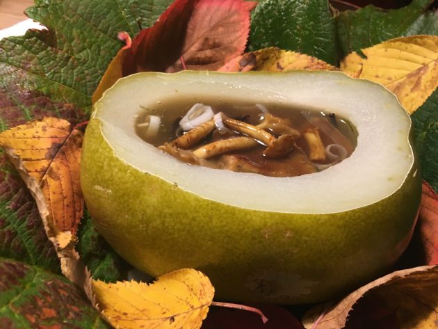 While serving us our noon meal of piping hot bowls of hittsumi (flour dumplings and mushroom broth), Noriko Kikuchi of Kikuchi Farm told us about how, after her hops are harvested and processed, she uses the residue to make paper.