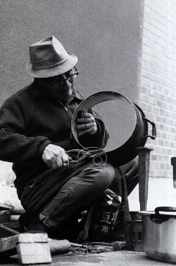 Splitting out another stave by hand, Miki-san grins patiently at the umpteenth camera and demonstrates the process of making wooden buckets, the kind no one uses anymore. He’s a curiosity now, a quaint glimpse of “the real thing,” seated on the floor of his cramped old shopfront using hands and toes to crank out props for samurai films and souvenirs for wealthy tourists who are bored with most of what money can buy. His neighbors are the only ones who really use his services. A few of them are still frugal enough to bring him worn-out buckets to repair, and he loves them for it. And yet once again, he will lead the tourists out to the back of his creaking wooden house without hesitation, past the well and the wood-burning stove and the outdoor shower and toilet that speak to his affluent guests of poverty, though he does not. He will never see the things they can’t live without, the dishwashers and garbage disposals and walk-in closets, and he has no interest in them. He is interested only in “working till he dies” he tells the cameraman, fussing with his potted plants out back “because green is restful for tired eyes”. He is as close as one can get to the past. With no son and no apprentice, he sips his sake and waits alone in a cold dark room each night for dawn to give him another day with his precious wood, another day to smile and teach what it means to love your work.